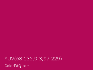 YUV 68.135,9.3,97.229 Color is a normal rose color and the nearest color is Lipstick #ab0563. Hex code #b30857 and RGB value is rgb(179,8,87). In RGB color space, this color is composed of 70% red, 3% green, 34% blue, In CMYK color space, this color is composed of 0% cyan, 96% magenta, 51% yellow , 30% black , In HSL color space, this color has a hue angle of 332° , 91% saturation and 37% lightness.