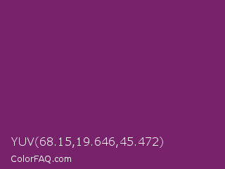 YUV 68.15,19.646,45.472 Color is a dark magenta color and the nearest color is Midnight #702670. Hex code #78226c and RGB value is rgb(120,34,108). In RGB color space, this color is composed of 47% red, 13% green, 42% blue, In CMYK color space, this color is composed of 0% cyan, 72% magenta, 10% yellow , 53% black , In HSL color space, this color has a hue angle of 308° , 56% saturation and 30% lightness.