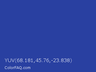 YUV 68.181,45.76,-23.838 Color is a normal blue color and the nearest color is Blue Pigment #333399. Hex code #2940a1 and RGB value is rgb(41,64,161). In RGB color space, this color is composed of 16% red, 25% green, 63% blue, In CMYK color space, this color is composed of 75% cyan, 60% magenta, 0% yellow , 37% black , In HSL color space, this color has a hue angle of 229° , 59% saturation and 40% lightness.