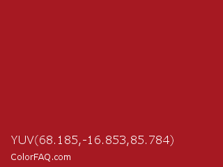 YUV 68.185,-16.853,85.784 Color is a normal red color and the nearest color is Mexican Red #a72525. Hex code #a61922 and RGB value is rgb(166,25,34). In RGB color space, this color is composed of 65% red, 10% green, 13% blue, In CMYK color space, this color is composed of 0% cyan, 85% magenta, 80% yellow , 35% black , In HSL color space, this color has a hue angle of 356° , 74% saturation and 37% lightness.