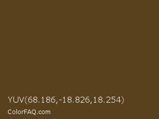 YUV 68.186,-18.826,18.254 Color is a dark orange color and the nearest color is Irish Coffee #5f3d26. Hex code #59411e and RGB value is rgb(89,65,30). In RGB color space, this color is composed of 35% red, 25% green, 12% blue, In CMYK color space, this color is composed of 0% cyan, 27% magenta, 66% yellow , 65% black , In HSL color space, this color has a hue angle of 36° , 50% saturation and 23% lightness.