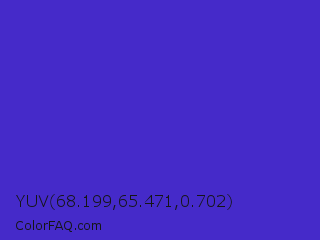 YUV 68.199,65.471,0.702 Color is a normal indigo color and the nearest color is Ocean Blue #4f42b5. Hex code #452ac9 and RGB value is rgb(69,42,201). In RGB color space, this color is composed of 27% red, 16% green, 79% blue, In CMYK color space, this color is composed of 66% cyan, 79% magenta, 0% yellow , 21% black , In HSL color space, this color has a hue angle of 250° , 65% saturation and 48% lightness.