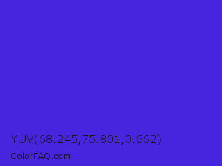 YUV 68.245,75.801,0.662 Color is a normal indigo color and the nearest color is Han Purple #5218fa. Hex code #4526de and RGB value is rgb(69,38,222). In RGB color space, this color is composed of 27% red, 15% green, 87% blue, In CMYK color space, this color is composed of 69% cyan, 83% magenta, 0% yellow , 13% black , In HSL color space, this color has a hue angle of 250° , 74% saturation and 51% lightness.