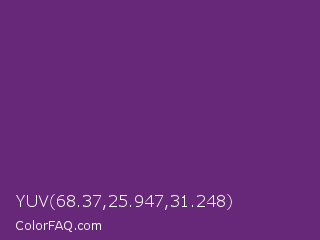 YUV 68.37,25.947,31.248 Color is a normal purple color and the nearest color is Midnight #702670. Hex code #682879 and RGB value is rgb(104,40,121). In RGB color space, this color is composed of 41% red, 16% green, 47% blue, In CMYK color space, this color is composed of 14% cyan, 67% magenta, 0% yellow , 53% black , In HSL color space, this color has a hue angle of 287° , 50% saturation and 32% lightness.