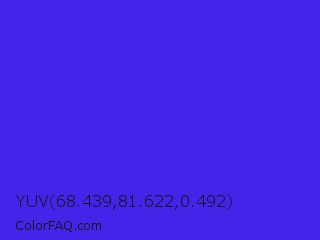 YUV 68.439,81.622,0.492 Color is a normal indigo color and the nearest color is Han Purple #5218fa. Hex code #4524ea and RGB value is rgb(69,36,234). In RGB color space, this color is composed of 27% red, 14% green, 92% blue, In CMYK color space, this color is composed of 71% cyan, 85% magenta, 0% yellow , 8% black , In HSL color space, this color has a hue angle of 250° , 83% saturation and 53% lightness.