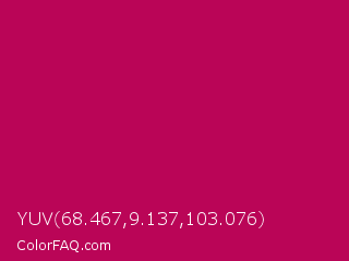 YUV 68.467,9.137,103.076 Color is a normal rose color and the nearest color is Pictorial Carmine #c30b4e. Hex code #ba0557 and RGB value is rgb(186,5,87). In RGB color space, this color is composed of 73% red, 2% green, 34% blue, In CMYK color space, this color is composed of 0% cyan, 97% magenta, 53% yellow , 27% black , In HSL color space, this color has a hue angle of 333° , 95% saturation and 37% lightness.