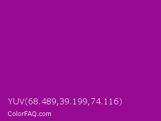 YUV 68.489,39.199,74.116 Color is a normal magenta color and the nearest color is Violet Eggplant #991199. Hex code #990a94 and RGB value is rgb(153,10,148). In RGB color space, this color is composed of 60% red, 4% green, 58% blue, In CMYK color space, this color is composed of 0% cyan, 93% magenta, 3% yellow , 40% black , In HSL color space, this color has a hue angle of 302° , 88% saturation and 32% lightness.