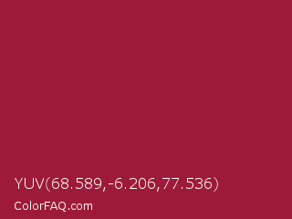 YUV 68.589,-6.206,77.536 Color is a normal red color and the nearest color is Vivid Burgundy #9f1d35. Hex code #9d1a38 and RGB value is rgb(157,26,56). In RGB color space, this color is composed of 62% red, 10% green, 22% blue, In CMYK color space, this color is composed of 0% cyan, 83% magenta, 64% yellow , 38% black , In HSL color space, this color has a hue angle of 346° , 72% saturation and 36% lightness.
