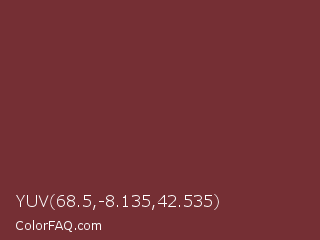 YUV 68.5,-8.135,42.535 Color is a normal red color and the nearest color is Wine #722f37. Hex code #752f34 and RGB value is rgb(117,47,52). In RGB color space, this color is composed of 46% red, 18% green, 20% blue, In CMYK color space, this color is composed of 0% cyan, 60% magenta, 56% yellow , 54% black , In HSL color space, this color has a hue angle of 356° , 43% saturation and 32% lightness.