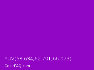 YUV 68.634,62.791,66.973 Color is a normal purple color and the nearest color is French Violet #8806ce. Hex code #9105c4 and RGB value is rgb(145,5,196). In RGB color space, this color is composed of 57% red, 2% green, 77% blue, In CMYK color space, this color is composed of 26% cyan, 97% magenta, 0% yellow , 23% black , In HSL color space, this color has a hue angle of 284° , 95% saturation and 39% lightness.