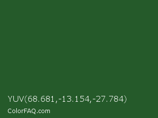 YUV 68.681,-13.154,-27.784 Color is a dark green color and the nearest color is Mughal Green #306030. Hex code #255a2a and RGB value is rgb(37,90,42). In RGB color space, this color is composed of 15% red, 35% green, 16% blue, In CMYK color space, this color is composed of 59% cyan, 0% magenta, 53% yellow , 65% black , In HSL color space, this color has a hue angle of 126° , 42% saturation and 25% lightness.