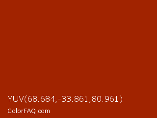 YUV 68.684,-33.861,80.961 Color is a normal red color and the nearest color is Rufous #a81c07. Hex code #a12300 and RGB value is rgb(161,35,-0). In RGB color space, this color is composed of 63% red, 14% green, 0% blue, In CMYK color space, this color is composed of 0% cyan, 78% magenta, 100% yellow , 37% black , In HSL color space, this color has a hue angle of 13° , 100% saturation and 32% lightness.