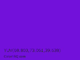 YUV 68.803,73.061,39.638 Color is a normal violet color and the nearest color is French Violet #8806ce. Hex code #7211d9 and RGB value is rgb(114,17,217). In RGB color space, this color is composed of 45% red, 7% green, 85% blue, In CMYK color space, this color is composed of 47% cyan, 92% magenta, 0% yellow , 15% black , In HSL color space, this color has a hue angle of 269° , 85% saturation and 46% lightness.