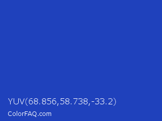 YUV 68.856,58.738,-33.2 Color is a normal blue color and the nearest color is Denim Blue #2243b6. Hex code #1f41bc and RGB value is rgb(31,65,188). In RGB color space, this color is composed of 12% red, 25% green, 74% blue, In CMYK color space, this color is composed of 84% cyan, 65% magenta, 0% yellow , 26% black , In HSL color space, this color has a hue angle of 227° , 72% saturation and 43% lightness.