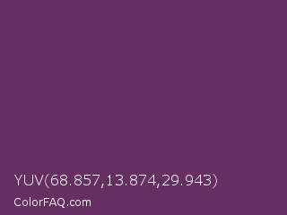 YUV 68.857,13.874,29.943 Color is a dark magenta color and the nearest color is Palatinate Purple #682860. Hex code #672e61 and RGB value is rgb(103,46,97). In RGB color space, this color is composed of 40% red, 18% green, 38% blue, In CMYK color space, this color is composed of 0% cyan, 55% magenta, 6% yellow , 60% black , In HSL color space, this color has a hue angle of 306° , 38% saturation and 29% lightness.