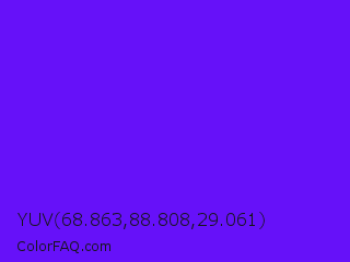 YUV 68.863,88.808,29.061 Color is a normal violet color and the nearest color is Electric Indigo #6f00ff. Hex code #6611f9 and RGB value is rgb(102,17,249). In RGB color space, this color is composed of 40% red, 7% green, 98% blue, In CMYK color space, this color is composed of 59% cyan, 93% magenta, 0% yellow , 2% black , In HSL color space, this color has a hue angle of 262° , 95% saturation and 52% lightness.