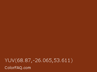 YUV 68.87,-26.065,53.611 Color is a dark orange color and the nearest color is Smokey Topaz #832a0d. Hex code #823010 and RGB value is rgb(130,48,16). In RGB color space, this color is composed of 51% red, 19% green, 6% blue, In CMYK color space, this color is composed of 0% cyan, 63% magenta, 88% yellow , 49% black , In HSL color space, this color has a hue angle of 17° , 78% saturation and 29% lightness.