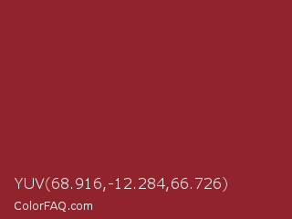 YUV 68.916,-12.284,66.726 Color is a normal red color and the nearest color is Vivid Auburn #922724. Hex code #91232c and RGB value is rgb(145,35,44). In RGB color space, this color is composed of 57% red, 14% green, 17% blue, In CMYK color space, this color is composed of 0% cyan, 76% magenta, 70% yellow , 43% black , In HSL color space, this color has a hue angle of 355° , 61% saturation and 35% lightness.