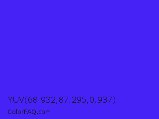YUV 68.932,87.295,0.937 Color is a normal indigo color and the nearest color is Han Purple #5218fa. Hex code #4622f6 and RGB value is rgb(70,34,246). In RGB color space, this color is composed of 27% red, 13% green, 96% blue, In CMYK color space, this color is composed of 72% cyan, 86% magenta, 0% yellow , 4% black , In HSL color space, this color has a hue angle of 250° , 92% saturation and 55% lightness.
