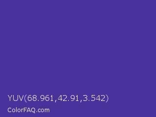 YUV 68.961,42.91,3.542 Color is a normal indigo color and the nearest color is Gigas #523c94. Hex code #49329c and RGB value is rgb(73,50,156). In RGB color space, this color is composed of 29% red, 20% green, 61% blue, In CMYK color space, this color is composed of 53% cyan, 68% magenta, 0% yellow , 39% black , In HSL color space, this color has a hue angle of 253° , 51% saturation and 40% lightness.