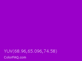 YUV 68.96,65.096,74.58 Color is a normal purple color and the nearest color is Purple Munsell #9f00c5. Hex code #9a00c9 and RGB value is rgb(154,-0,201). In RGB color space, this color is composed of 60% red, 0% green, 79% blue, In CMYK color space, this color is composed of 23% cyan, 100% magenta, 0% yellow , 21% black , In HSL color space, this color has a hue angle of 286° , 100% saturation and 39% lightness.