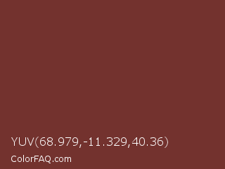 YUV 68.979,-11.329,40.36 Color is a normal red color and the nearest color is Wine #722f37. Hex code #73322e and RGB value is rgb(115,50,46). In RGB color space, this color is composed of 45% red, 20% green, 18% blue, In CMYK color space, this color is composed of 0% cyan, 57% magenta, 60% yellow , 55% black , In HSL color space, this color has a hue angle of 3° , 43% saturation and 32% lightness.