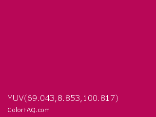 YUV 69.043,8.853,100.817 Color is a normal rose color and the nearest color is Pictorial Carmine #c30b4e. Hex code #b80757 and RGB value is rgb(184,7,87). In RGB color space, this color is composed of 72% red, 3% green, 34% blue, In CMYK color space, this color is composed of 0% cyan, 96% magenta, 53% yellow , 28% black , In HSL color space, this color has a hue angle of 333° , 93% saturation and 37% lightness.