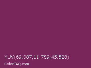 YUV 69.087,11.789,45.528 Color is a normal magenta color and the nearest color is Byzantium #702963. Hex code #79265d and RGB value is rgb(121,38,93). In RGB color space, this color is composed of 47% red, 15% green, 36% blue, In CMYK color space, this color is composed of 0% cyan, 69% magenta, 23% yellow , 53% black , In HSL color space, this color has a hue angle of 320° , 52% saturation and 31% lightness.