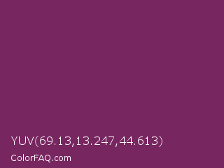 YUV 69.13,13.247,44.613 Color is a normal magenta color and the nearest color is Byzantium #702963. Hex code #782660 and RGB value is rgb(120,38,96). In RGB color space, this color is composed of 47% red, 15% green, 38% blue, In CMYK color space, this color is composed of 0% cyan, 68% magenta, 20% yellow , 53% black , In HSL color space, this color has a hue angle of 318° , 52% saturation and 31% lightness.