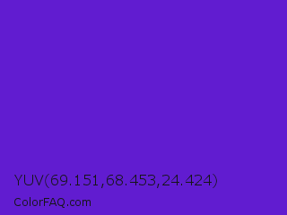 YUV 69.151,68.453,24.424 Color is a normal violet color and the nearest color is Purple Heart Crayola #652dc1. Hex code #611cd0 and RGB value is rgb(97,28,208). In RGB color space, this color is composed of 38% red, 11% green, 82% blue, In CMYK color space, this color is composed of 53% cyan, 87% magenta, 0% yellow , 18% black , In HSL color space, this color has a hue angle of 263° , 76% saturation and 46% lightness.