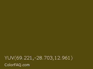YUV 69.221,-28.703,12.961 Color is a very dark yellow color and the nearest color is Bronze Olive #4e420c. Hex code #54490b and RGB value is rgb(84,73,11). In RGB color space, this color is composed of 33% red, 29% green, 4% blue, In CMYK color space, this color is composed of 0% cyan, 13% magenta, 87% yellow , 67% black , In HSL color space, this color has a hue angle of 51° , 77% saturation and 19% lightness.