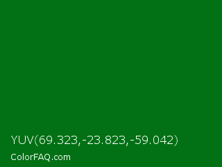 YUV 69.323,-23.823,-59.042 Color is a dark green color and the nearest color is Deep Green #056608. Hex code #027115 and RGB value is rgb(2,113,21). In RGB color space, this color is composed of 1% red, 44% green, 8% blue, In CMYK color space, this color is composed of 98% cyan, 0% magenta, 81% yellow , 56% black , In HSL color space, this color has a hue angle of 130° , 97% saturation and 23% lightness.