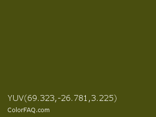YUV 69.323,-26.781,3.225 Color is a very dark yellow color and the nearest color is Bronze Olive #4e420c. Hex code #494e0f and RGB value is rgb(73,78,15). In RGB color space, this color is composed of 29% red, 31% green, 6% blue, In CMYK color space, this color is composed of 6% cyan, 0% magenta, 81% yellow , 69% black , In HSL color space, this color has a hue angle of 65° , 68% saturation and 18% lightness.