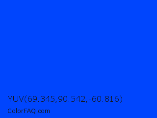 YUV 69.345,90.542,-60.816 Color is a normal blue color and the nearest color is Blue RYB #0247fe. Hex code #0045fd and RGB value is rgb(0,69,253). In RGB color space, this color is composed of 0% red, 27% green, 99% blue, In CMYK color space, this color is composed of 100% cyan, 73% magenta, 0% yellow , 1% black , In HSL color space, this color has a hue angle of 224° , 100% saturation and 50% lightness.