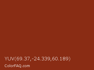 YUV 69.37,-24.339,60.189 Color is a normal red color and the nearest color is Kobe #882d17. Hex code #8a2c14 and RGB value is rgb(138,44,20). In RGB color space, this color is composed of 54% red, 17% green, 8% blue, In CMYK color space, this color is composed of 0% cyan, 68% magenta, 86% yellow , 46% black , In HSL color space, this color has a hue angle of 12° , 75% saturation and 31% lightness.