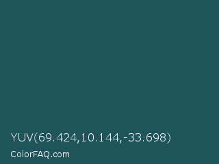 YUV 69.424,10.144,-33.698 Color is a dark cyan color and the nearest color is Blue Dianne #204852. Hex code #1f555a and RGB value is rgb(31,85,90). In RGB color space, this color is composed of 12% red, 33% green, 35% blue, In CMYK color space, this color is composed of 66% cyan, 6% magenta, 0% yellow , 65% black , In HSL color space, this color has a hue angle of 185° , 49% saturation and 24% lightness.