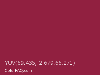 YUV 69.435,-2.679,66.271 Color is a normal rose color and the nearest color is Big Dip O Ruby #9c2542. Hex code #912040 and RGB value is rgb(145,32,64). In RGB color space, this color is composed of 57% red, 13% green, 25% blue, In CMYK color space, this color is composed of 0% cyan, 78% magenta, 56% yellow , 43% black , In HSL color space, this color has a hue angle of 343° , 64% saturation and 35% lightness.