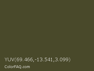 YUV 69.466,-13.541,3.099 Color is a dark yellow color and the nearest color is Woodland #4d5328. Hex code #49492a and RGB value is rgb(73,73,42). In RGB color space, this color is composed of 29% red, 29% green, 16% blue, In CMYK color space, this color is composed of 0% cyan, 0% magenta, 42% yellow , 71% black , In HSL color space, this color has a hue angle of 60° , 27% saturation and 23% lightness.