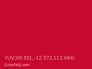 YUV 69.501,-12.572,112.694 Color is a normal red color and the nearest color is Red NCS #c40233. Hex code #c6092c and RGB value is rgb(198,9,44). In RGB color space, this color is composed of 78% red, 4% green, 17% blue, In CMYK color space, this color is composed of 0% cyan, 95% magenta, 78% yellow , 22% black , In HSL color space, this color has a hue angle of 349° , 91% saturation and 41% lightness.
