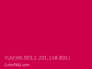 YUV 69.503,1.231,118.831 Color is a normal rose color and the nearest color is Spanish Carmine #d10047. Hex code #cd0048 and RGB value is rgb(205,-0,72). In RGB color space, this color is composed of 80% red, 0% green, 28% blue, In CMYK color space, this color is composed of 0% cyan, 100% magenta, 65% yellow , 20% black , In HSL color space, this color has a hue angle of 339° , 100% saturation and 40% lightness.
