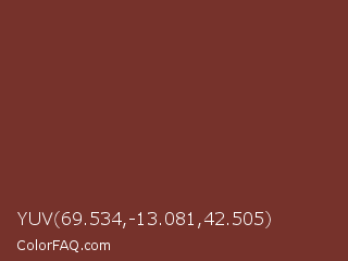 YUV 69.534,-13.081,42.505 Color is a normal red color and the nearest color is Wine #722f37. Hex code #76322b and RGB value is rgb(118,50,43). In RGB color space, this color is composed of 46% red, 20% green, 17% blue, In CMYK color space, this color is composed of 0% cyan, 58% magenta, 64% yellow , 54% black , In HSL color space, this color has a hue angle of 6° , 47% saturation and 32% lightness.