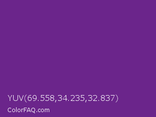 YUV 69.558,34.235,32.837 Color is a normal purple color and the nearest color is Seance #731e8f. Hex code #6b258b and RGB value is rgb(107,37,139). In RGB color space, this color is composed of 42% red, 15% green, 55% blue, In CMYK color space, this color is composed of 23% cyan, 73% magenta, 0% yellow , 45% black , In HSL color space, this color has a hue angle of 281° , 58% saturation and 35% lightness.