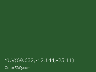 YUV 69.632,-12.144,-25.11 Color is a dark green color and the nearest color is Mughal Green #306030. Hex code #29592d and RGB value is rgb(41,89,45). In RGB color space, this color is composed of 16% red, 35% green, 18% blue, In CMYK color space, this color is composed of 54% cyan, 0% magenta, 49% yellow , 65% black , In HSL color space, this color has a hue angle of 125° , 37% saturation and 25% lightness.