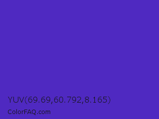 YUV 69.69,60.792,8.165 Color is a normal indigo color and the nearest color is Purple Heart Crayola #652dc1. Hex code #4f29c1 and RGB value is rgb(79,41,193). In RGB color space, this color is composed of 31% red, 16% green, 76% blue, In CMYK color space, this color is composed of 59% cyan, 79% magenta, 0% yellow , 24% black , In HSL color space, this color has a hue angle of 255° , 65% saturation and 46% lightness.
