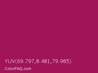 YUV 69.797,8.481,79.985 Color is a normal rose color and the nearest color is Jazzberry Jam #a50b5e. Hex code #a11457 and RGB value is rgb(161,20,87). In RGB color space, this color is composed of 63% red, 8% green, 34% blue, In CMYK color space, this color is composed of 0% cyan, 88% magenta, 46% yellow , 37% black , In HSL color space, this color has a hue angle of 331° , 78% saturation and 35% lightness.