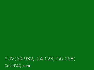 YUV 69.932,-24.123,-56.068 Color is a dark green color and the nearest color is Deep Green #056608. Hex code #067015 and RGB value is rgb(6,112,21). In RGB color space, this color is composed of 2% red, 44% green, 8% blue, In CMYK color space, this color is composed of 95% cyan, 0% magenta, 81% yellow , 56% black , In HSL color space, this color has a hue angle of 128° , 90% saturation and 23% lightness.