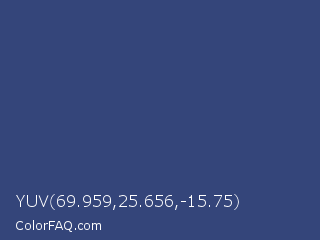 YUV 69.959,25.656,-15.75 Color is a normal blue color and the nearest color is East Bay #414c7d. Hex code #34457a and RGB value is rgb(52,69,122). In RGB color space, this color is composed of 20% red, 27% green, 48% blue, In CMYK color space, this color is composed of 57% cyan, 43% magenta, 0% yellow , 52% black , In HSL color space, this color has a hue angle of 225° , 40% saturation and 34% lightness.