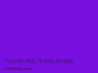 YUV 69.993,74.939,43.856 Color is a normal violet color and the nearest color is French Violet #8806ce. Hex code #780fde and RGB value is rgb(120,15,222). In RGB color space, this color is composed of 47% red, 6% green, 87% blue, In CMYK color space, this color is composed of 46% cyan, 93% magenta, 0% yellow , 13% black , In HSL color space, this color has a hue angle of 270° , 87% saturation and 46% lightness.