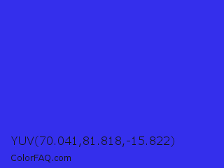 YUV 70.041,81.818,-15.822 Color is a normal indigo color and the nearest color is Palatinate Blue #273be2. Hex code #342fec and RGB value is rgb(52,47,236). In RGB color space, this color is composed of 20% red, 18% green, 93% blue, In CMYK color space, this color is composed of 78% cyan, 80% magenta, 0% yellow , 7% black , In HSL color space, this color has a hue angle of 242° , 83% saturation and 55% lightness.