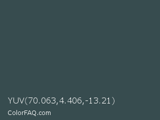 YUV 70.063,4.406,-13.21 Color is a dark cyan color and the nearest color is Limed Spruce #394851. Hex code #374c4f and RGB value is rgb(55,76,79). In RGB color space, this color is composed of 22% red, 30% green, 31% blue, In CMYK color space, this color is composed of 30% cyan, 4% magenta, 0% yellow , 69% black , In HSL color space, this color has a hue angle of 188° , 18% saturation and 26% lightness.